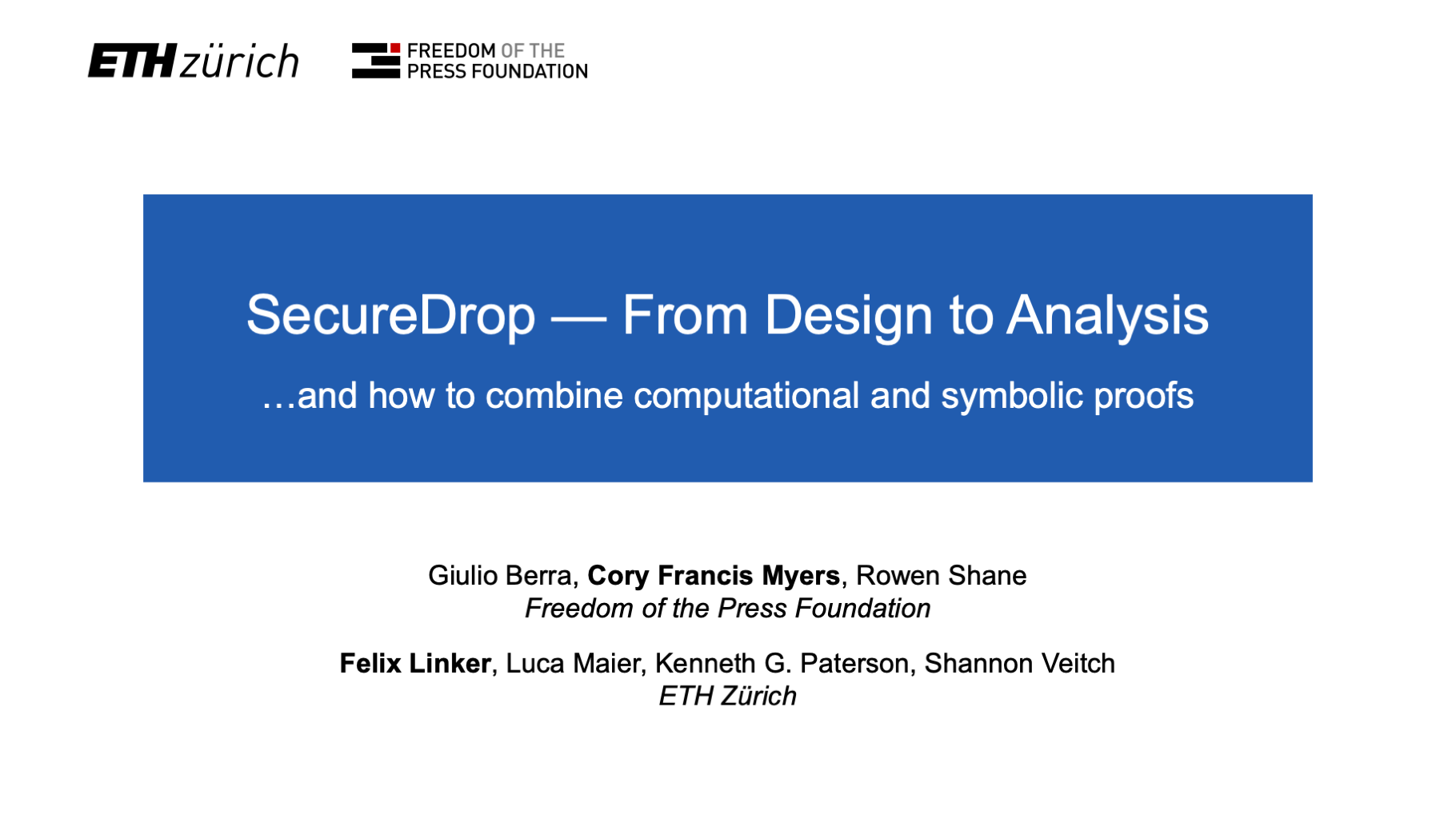 SecureDrop software engineer Cory Myers and ETH Zurich researcher Felix Linker gave a talk entitled “SecureDrop — From Design to Analysis” to the Usable Formal Methods Research Group at the 124th meeting of the Internet Engineering Task Force in Montreal on Nov. 4, 2025.